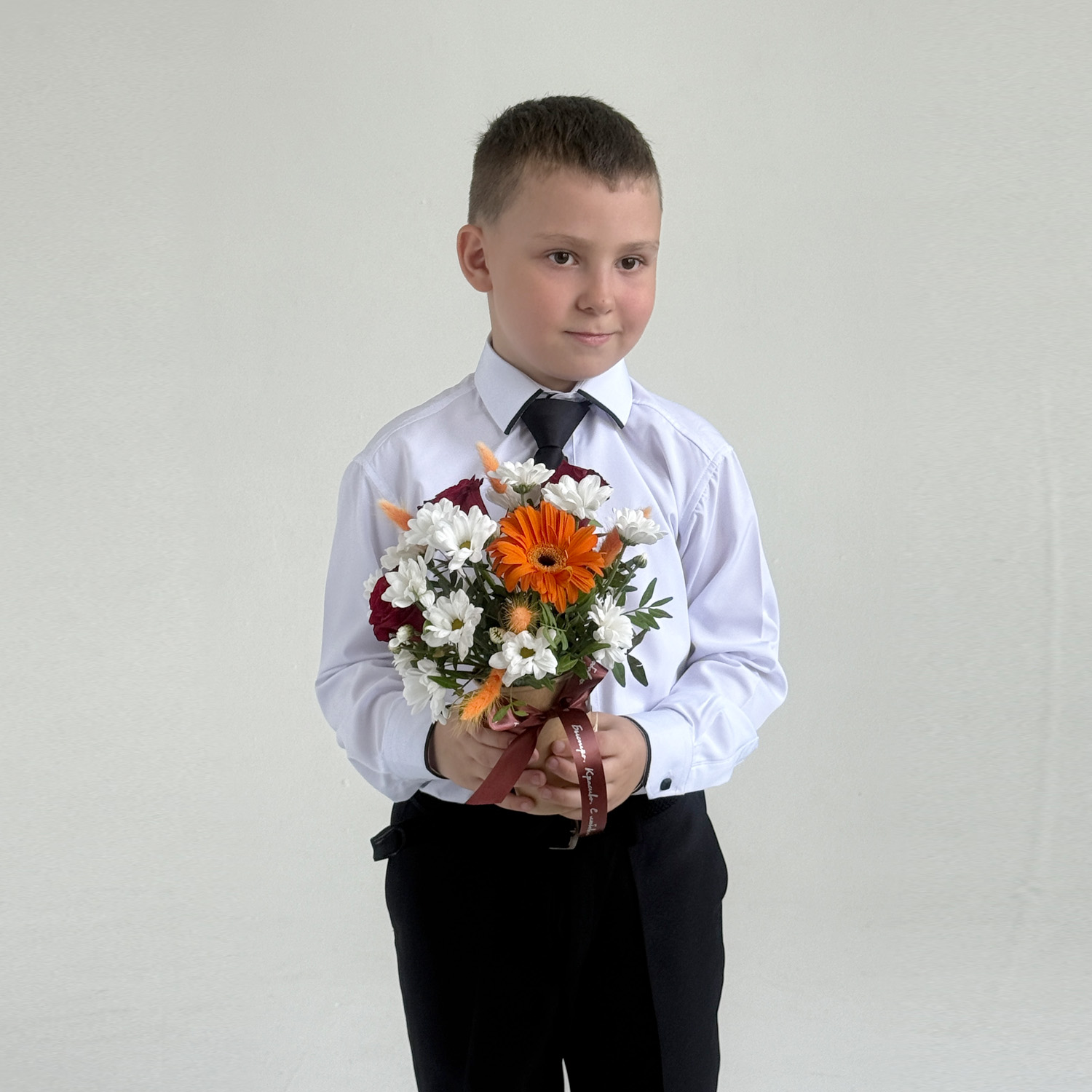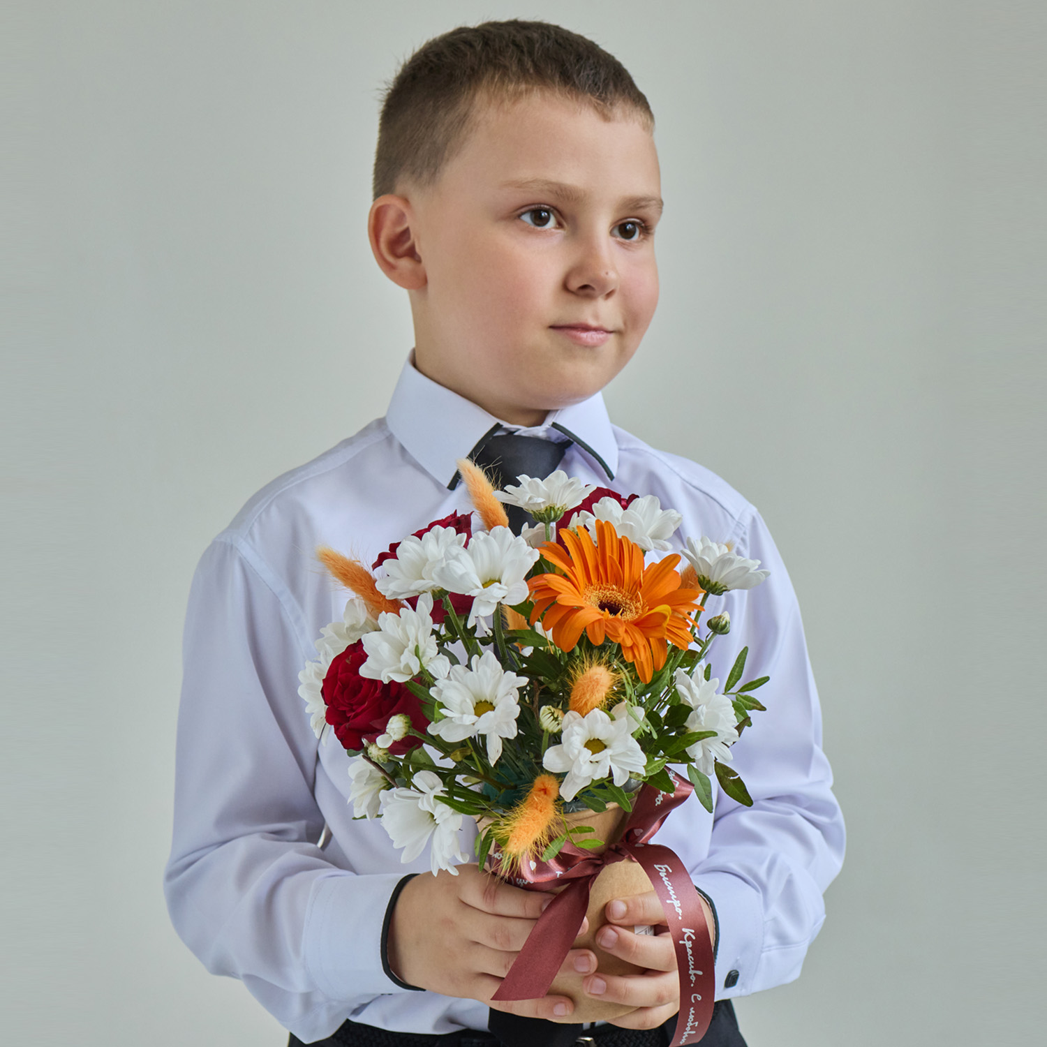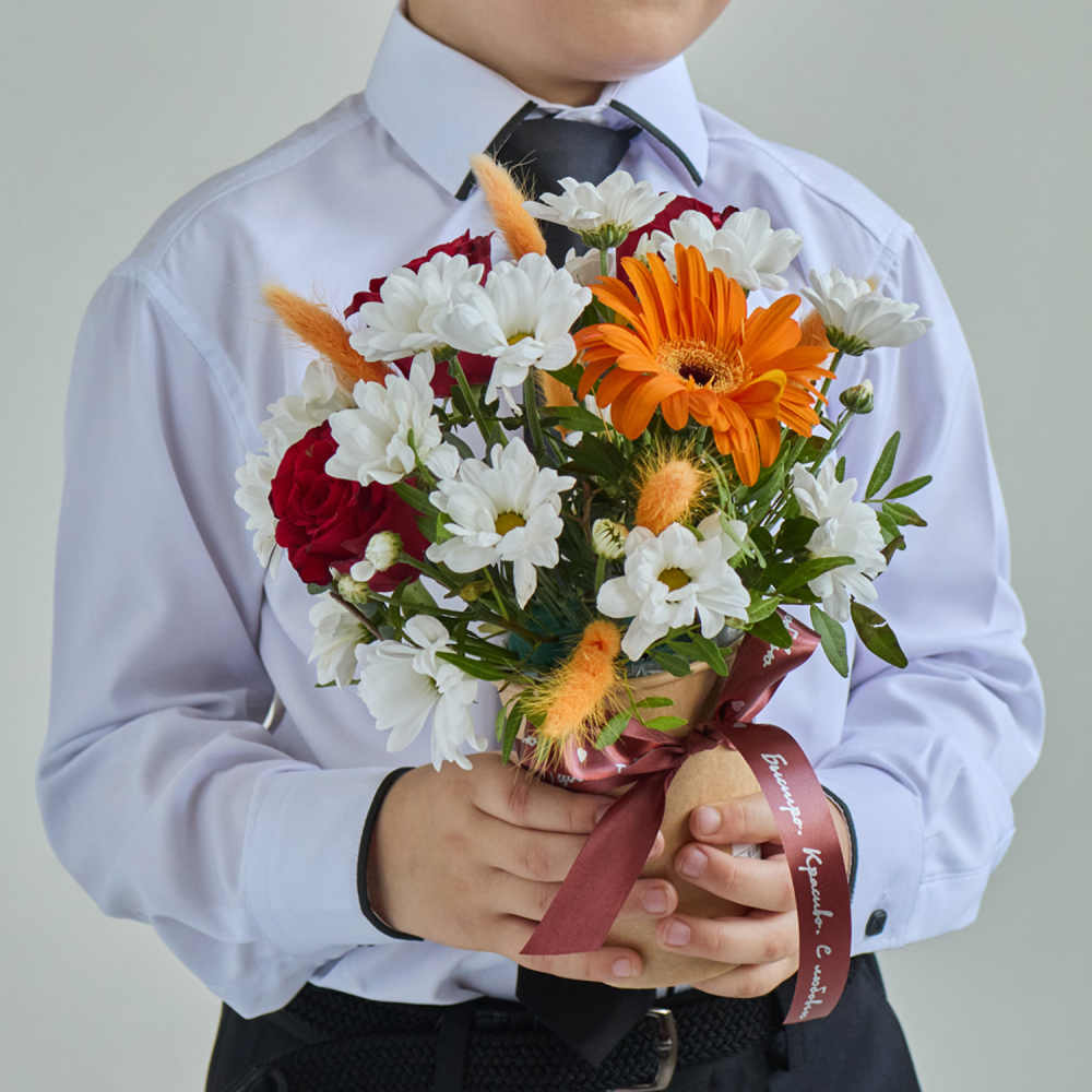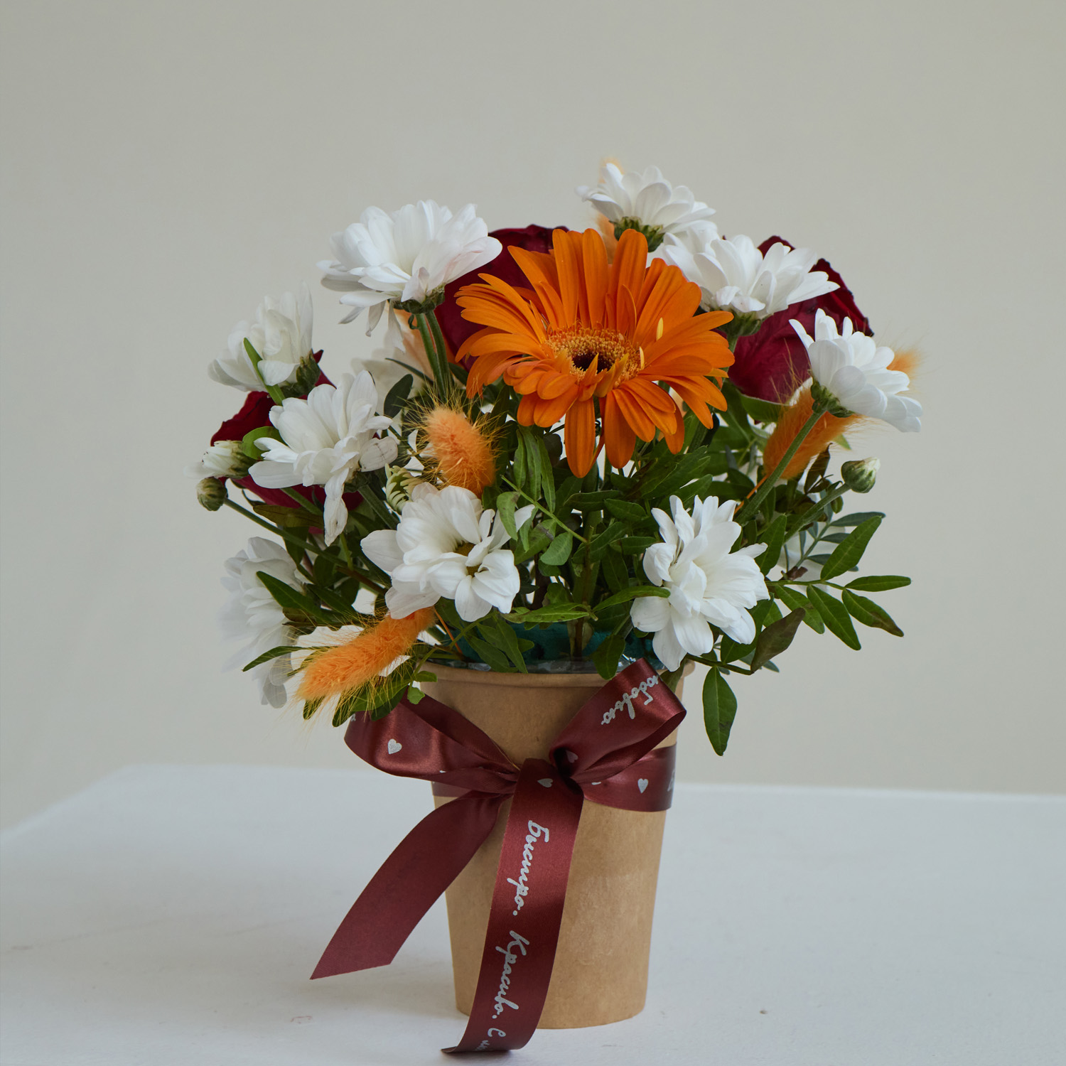 Такой вариант подойдёт для школьной линейки, чтобы ребёнок чувствовал себя уверенно и празднично. Композиция будет уместна и как знак внимания учителю, и как милый подарок ребенку. Цветы в стаканчике выглядят аккуратно, стильно и современно, сохраняя при этом праздничное настроение.