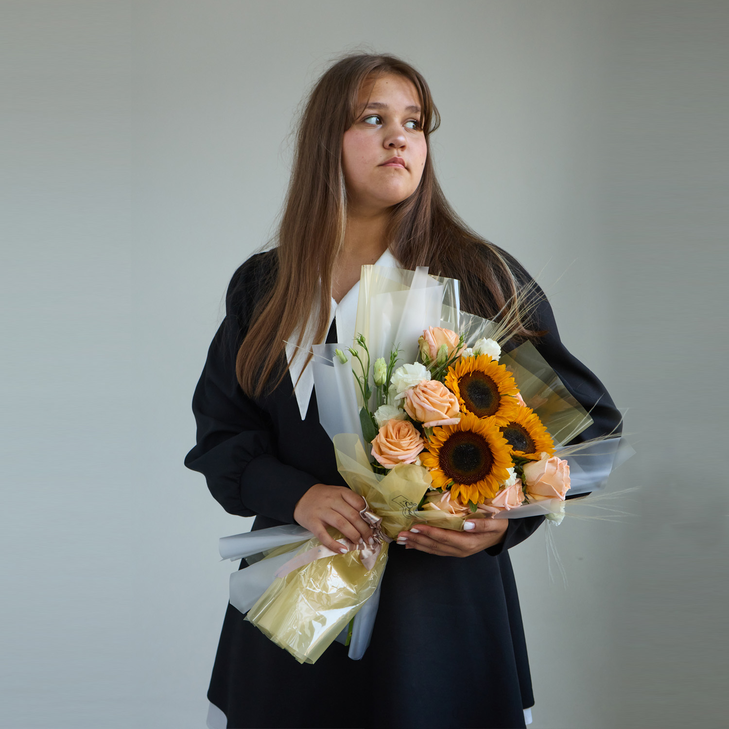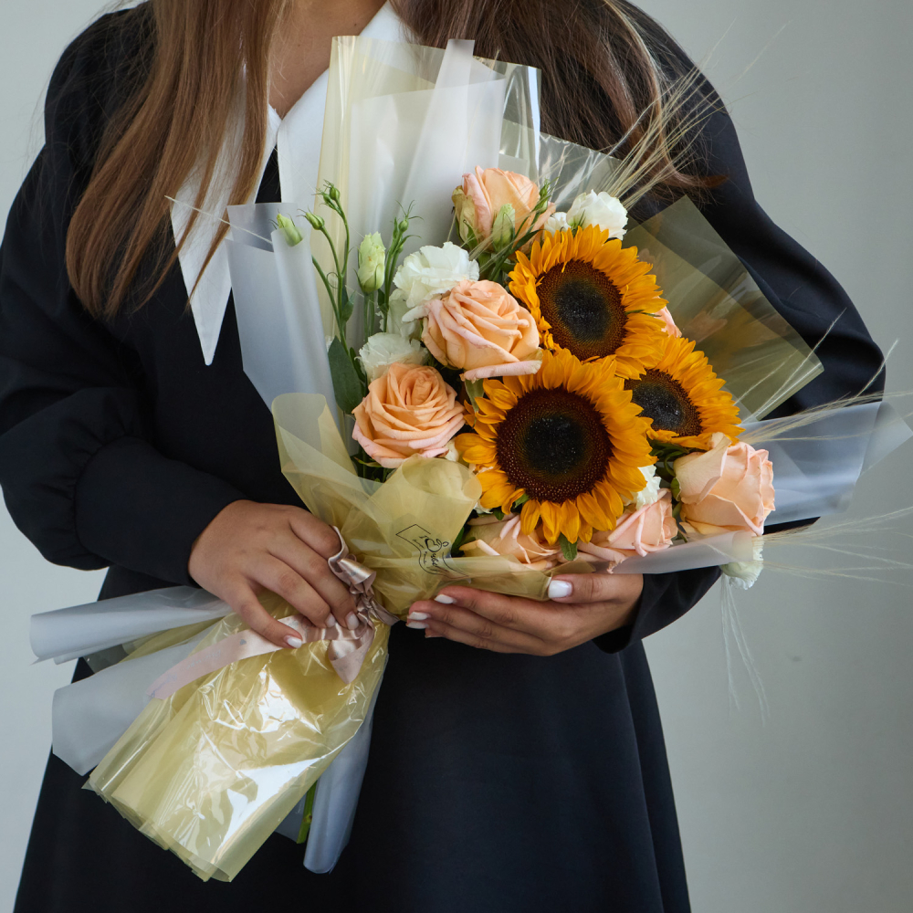 Этот букет с подсолнухами идеально подойдёт на день рождения, в качестве подарка для любимого человека или как яркий акцент на 1 сентября для старшеклассников. Осенняя гамма придаёт композиции тёплый и жизнерадостный характер, а сочетание крупных и нежных цветов делает её универсальной для разных случаев. Он производит впечатление живого, солнечного подарка, наполненного позитивной энергией.