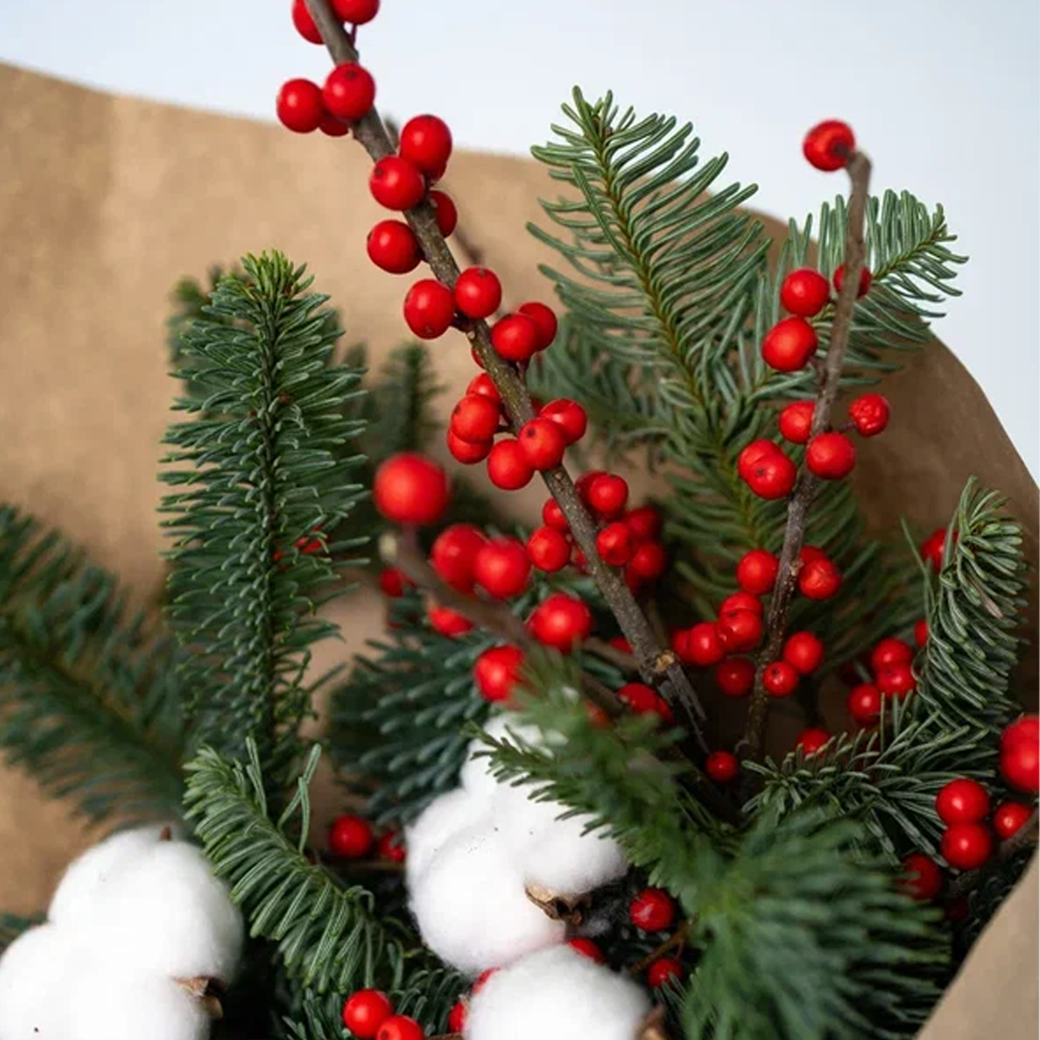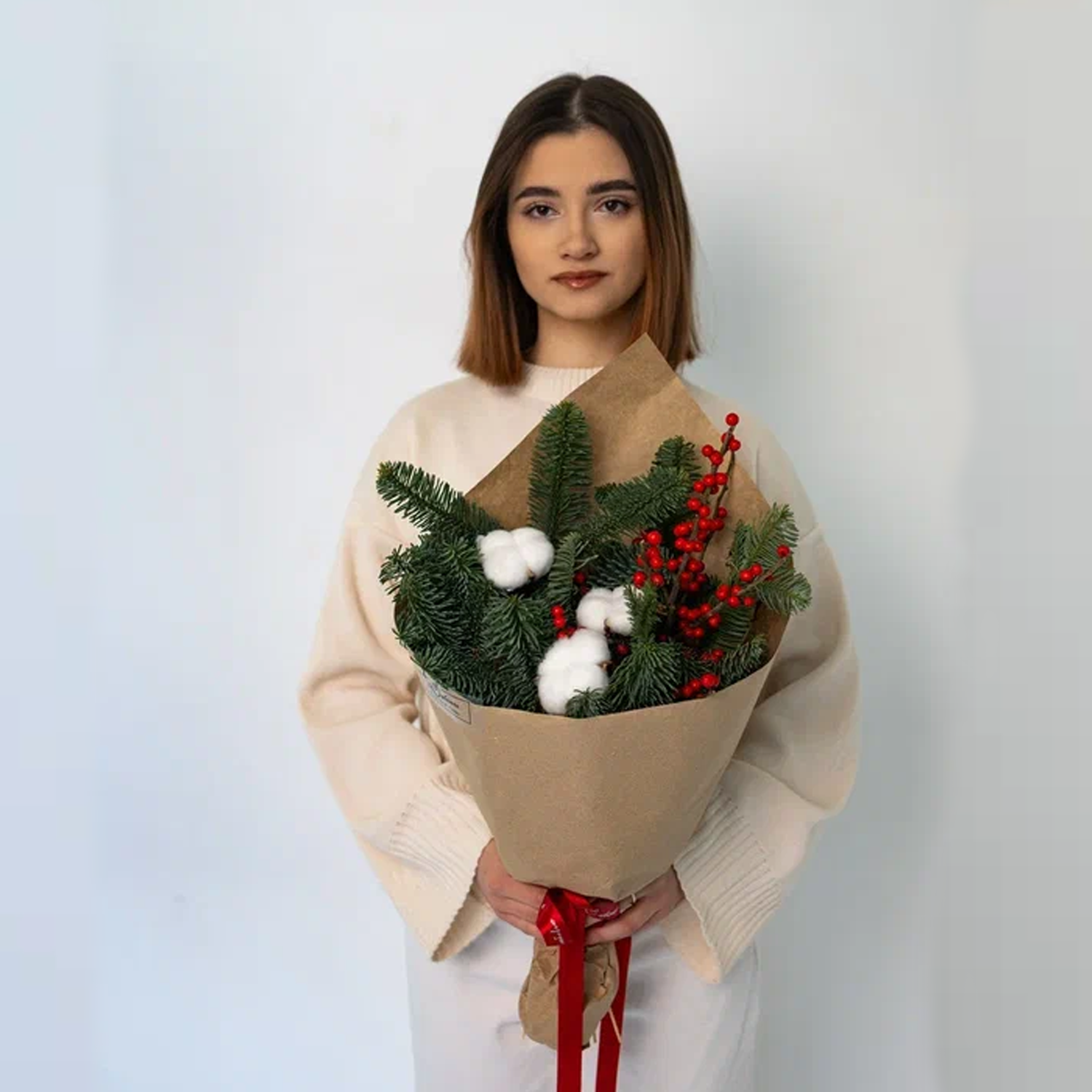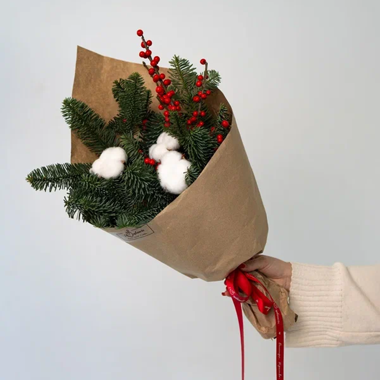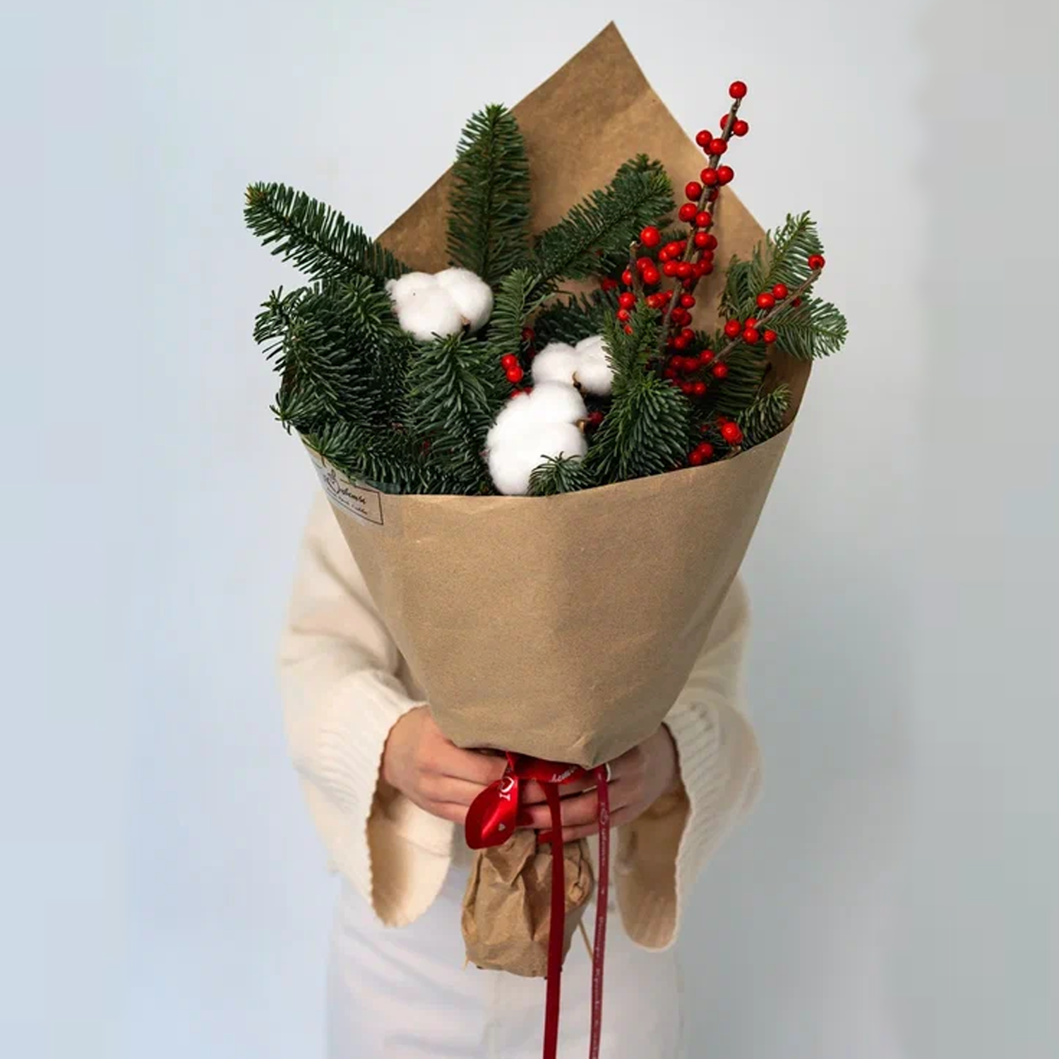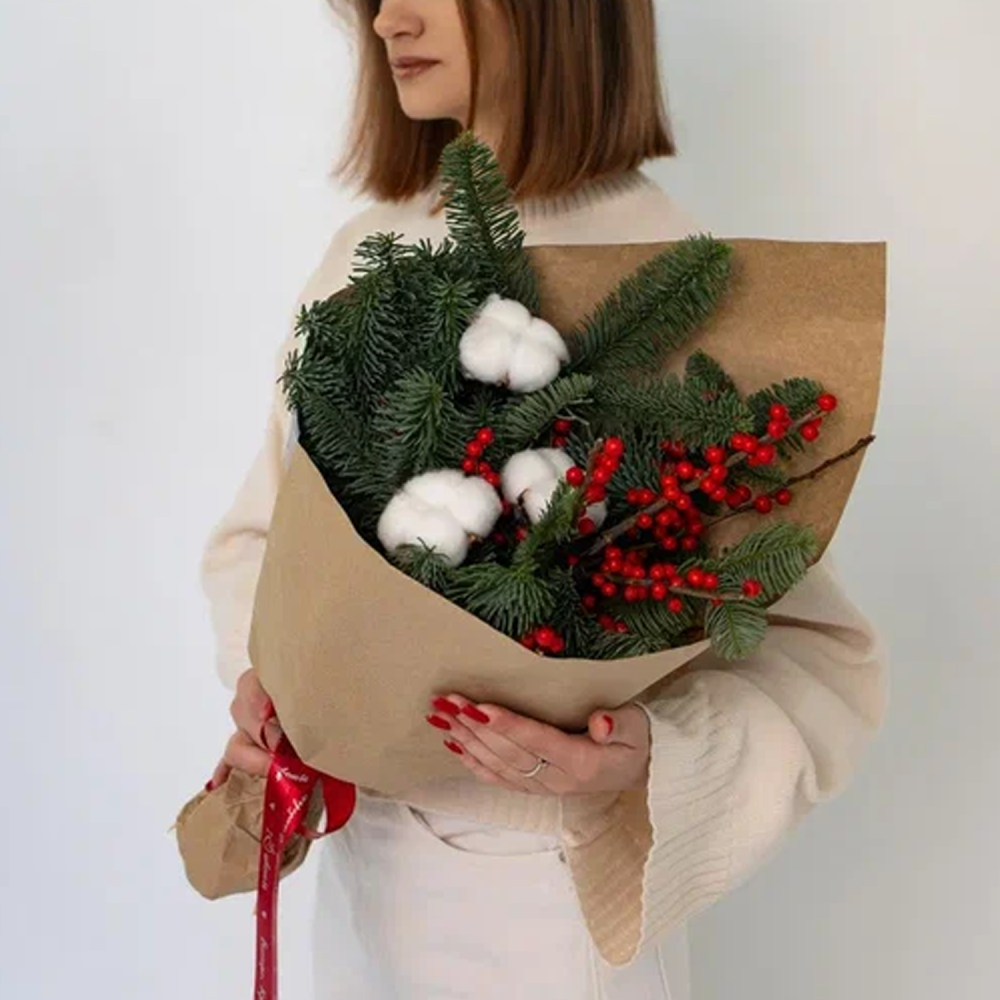 Букет с еловыми ветками, ягодами и хлопком "Зимняя классика" N 90872-S размер S