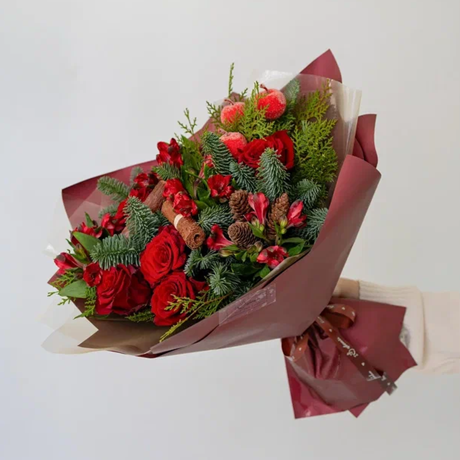 Чтобы розы и еловые ветки дольше оставались свежими, подрежьте стебли, поставьте букет в чистую прохладную воду и держите подальше от батарей и прямого солнца. Хвоя нобилиса долго не осыпается. Такие цветы с доставкой удобно заказать прямо сейчас, и зимний букет будет у вас уже сегодня.