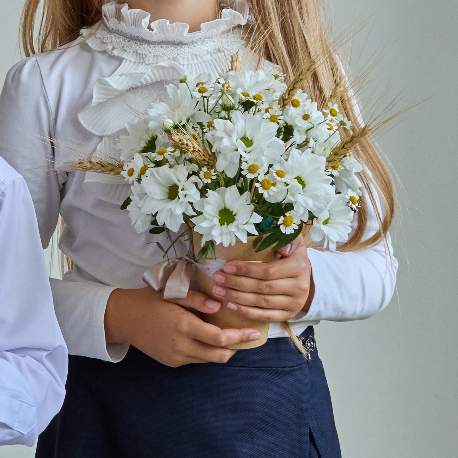 Этот букет на 1 сентября станет практичным решением для школьной линейки: он лёгкий, компактный и не требует вазы. Его можно подарить учителю, вручить ребёнку для торжественного фото — композиция подчеркнёт праздничность момента, сохраняя при этом комфорт и простоту. Такой формат особенно удобен для детей, ведь стаканчик не занимает много места и не доставляет хлопот.