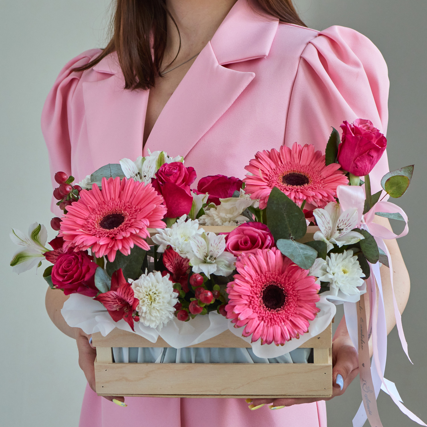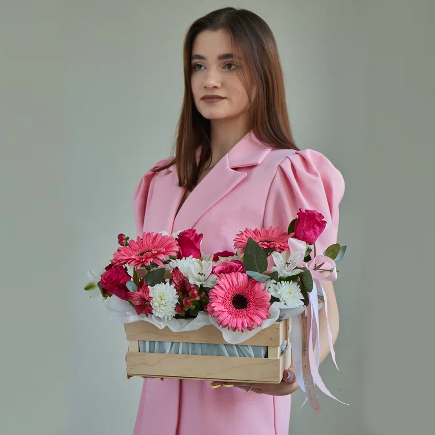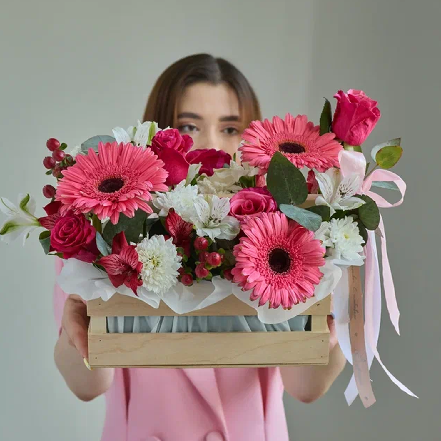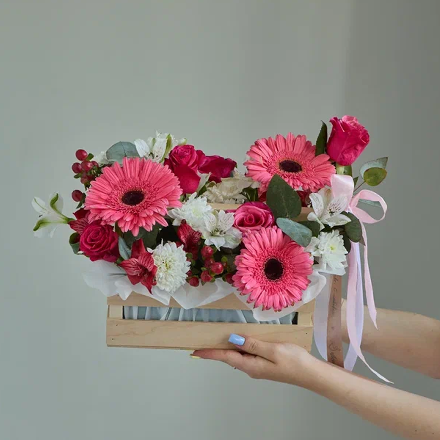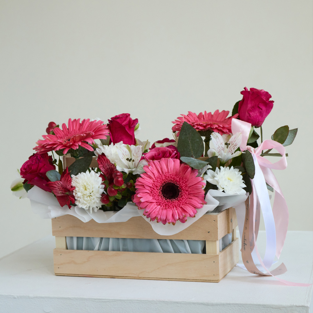 Чтобы цветы радовали дольше, поставьте ящик в прохладное место и слегка подливайте воду во флористическую губку раз в два дня. Избегайте прямого солнца и сквозняков. Закажите — и цветы с доставкой создадут настроение уже сегодня.
